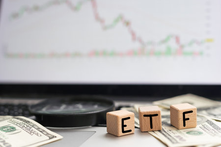 ETF - exchange-traded fund. Business concept on wooden cubes and dollars background
