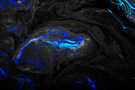 Wet marble. Ink blend. Blur cyan blue black color glowing texture liquid acrylic emulsion flow wave dark abstract art background.