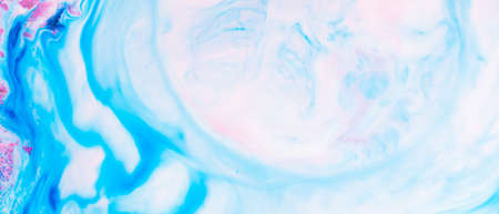 Fluid art texture. Abstract background with swirling paint effect. Liquid acrylic picture with flowing bubbles. Mixed paints for baner or wallpaper. Lavender, pink, blue and white overflowing colors.