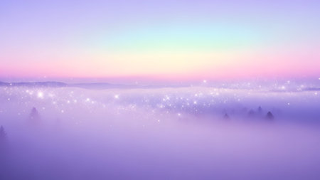 Fantasy landscape captures mystical sunset over foggy forest, with soft purple, pink, and yellow hues across sky.