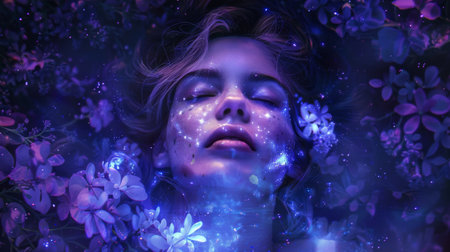 Dreamlike Woman with Glowing Face Surrounded by Flowers and Stars in Fantasy Setting