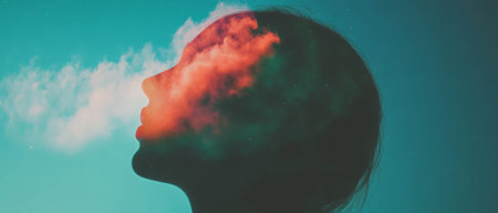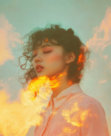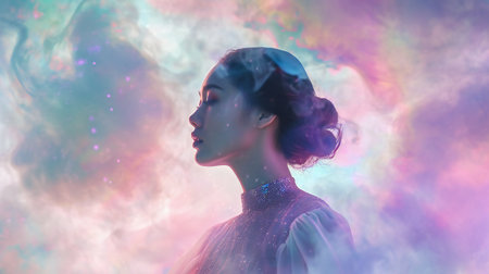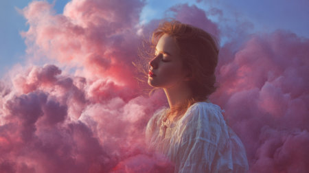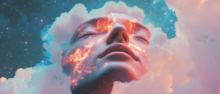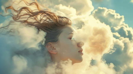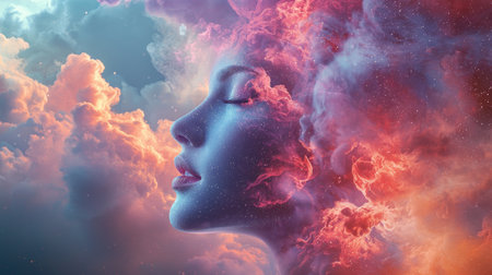 Surreal portrait of a woman with her face blending into clouds and nebulae. Represents imagination, creativity, and dreams in a cosmic, artistic setting.