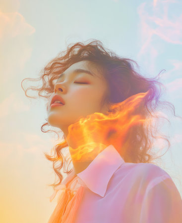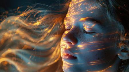 Portrait of beautiful female teenager face relaxing and sleeping surrounded with glowing aura while her hair blowing. Close up of attractive woman closing her eyes and absorbing power of light. AIG42.
