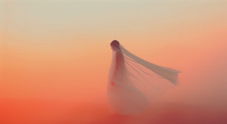 A lone figure dressed in flowing garments walks gracefully through a misty landscape at dusk, surrounded by soft pastel colors of orange and pink, creating a serene and mystical atmosphere.