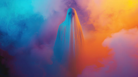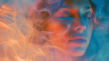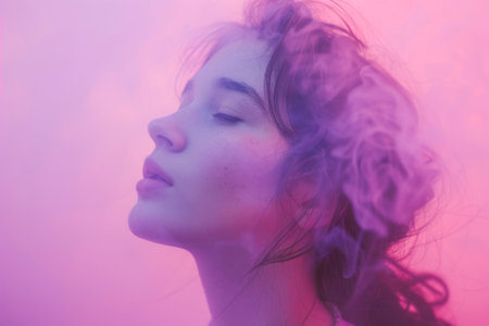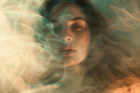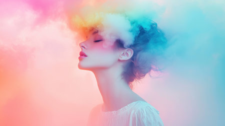 Ethereal beauty portrait of a woman with colorful smoke around her, evoking emotions of serenity and creativity, ideal for wellness and artistic themes