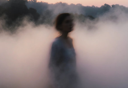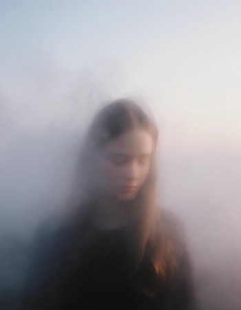 In the early morning light, a girl stands amidst a thick haze, her figure appearing ghostly and serene. The soft colors of dawn blend with the fog, enhancing the dreamlike scene.
