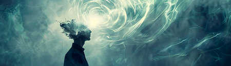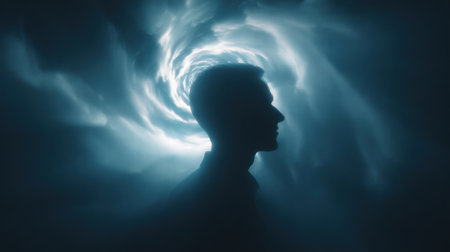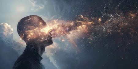 A man's face is obscured by a cloud of glowing particles. Concept of mystery and wonder, as if the man is experiencing a moment of deep thought or contemplation