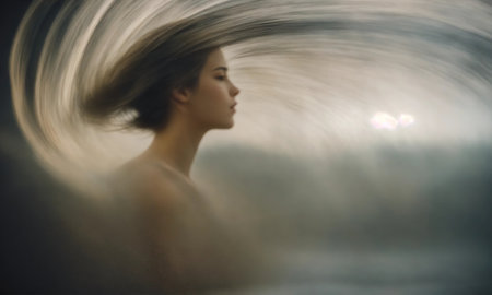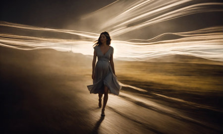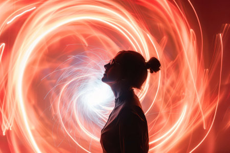 A woman with a tied-back hairstyle stands in profile against a vibrant backdrop of swirling lights. The colors of red and white create a dynamic effect as they spiral around her figure, highlighting her silhouette. The scene evokes a sense of wonder and movement, capturing an enchanting moment during nighttime.