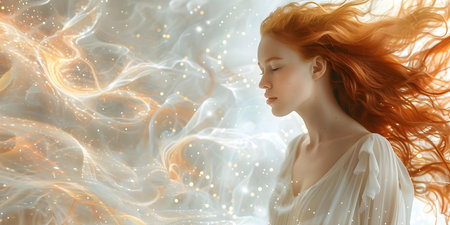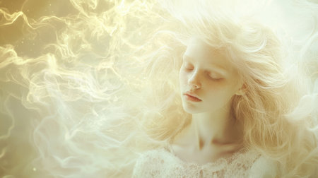 A serene figure with long, flowing hair appears surrounded by soft, warm light. The atmosphere creates an otherworldly ambiance that evokes a sense of tranquility.