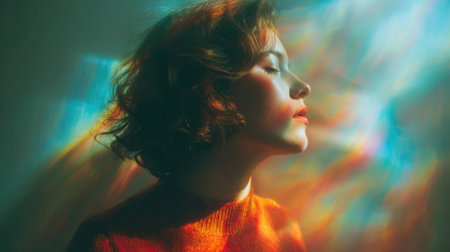 A young person with curly hair stands in a serene pose lost in thought as vibrant light patterns dance around them creating an enchanting atmosphere.