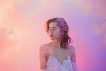 Artistic portrait against a dreamy gradient background blending from soft pink to lavender.