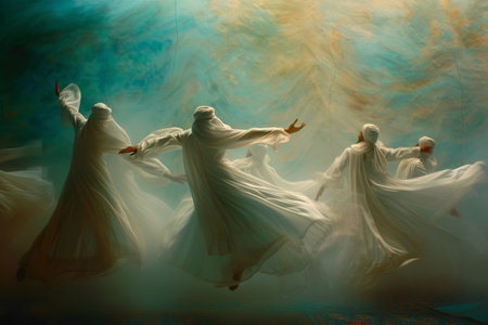 A Painting of Four Women in White Dresses, Floating dervishes in a mystical Sufi whirling ceremony, AI Generated