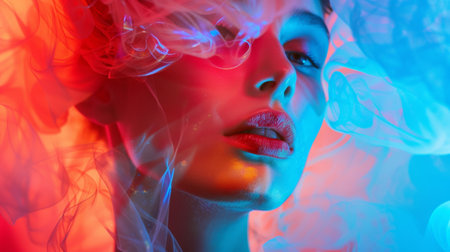 A striking close-up portrait of a woman surrounded by swirls of vibrant red and blue smoke. The soft lighting and artistic use of color create a dramatic and ethereal effect.