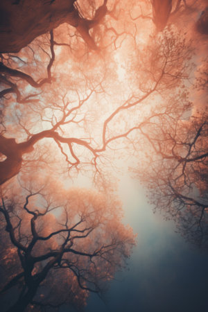 Looking up mystic forest. Blurred, mystical, natural background of trees. Bottom view