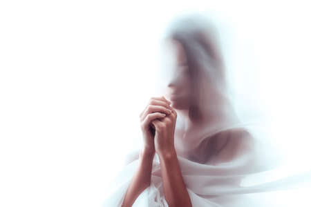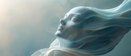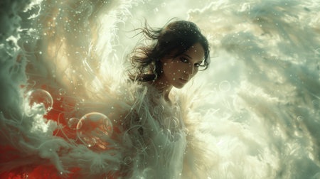 A serene woman is surrounded by flowing fabric that billows around her, creating a dreamy atmosphere.