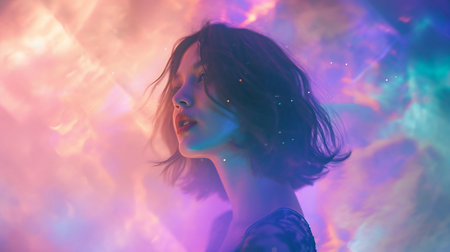 A woman standing in front of a colorful background with blurred lights, AI