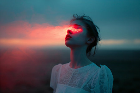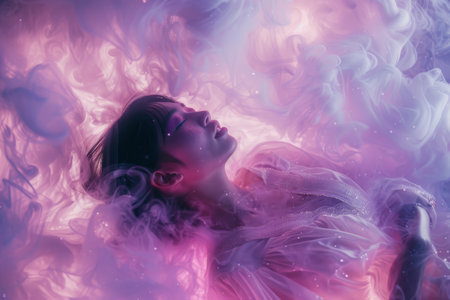 A girl stands in a magical cloud of pink hues lost in her thoughts at dusk embracing tranquility.