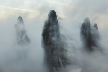Silhouettes of people in the fog on a misty day