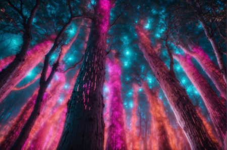 Fantasy infrared image of a magical forest illuminated by neon lights.