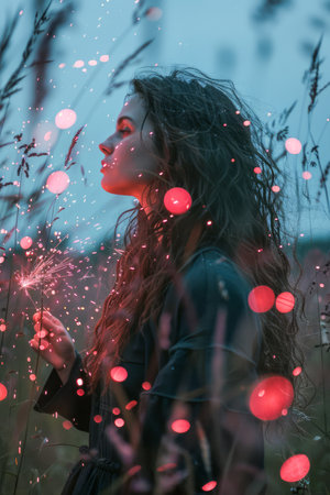 Enchanting Woman Holding Sparkler Amongst Twinkling Lights in Dusk Setting AI Generative