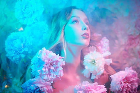 Beauty and flowers concept. Portrait of a magnificent brunette woman with bright make-up lying among peony flowers covered with a veil and surrounded by haze. Cosmetics, make-up. Perfumery.