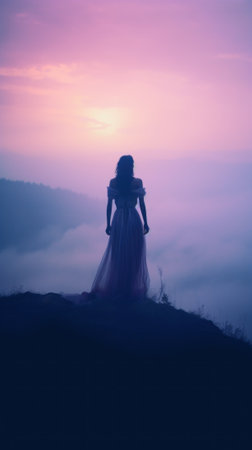 A woman in a long dress standing on a hill. Generative AI image.