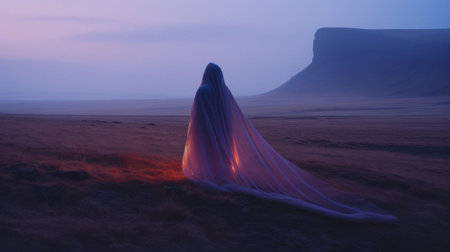 a young man with a cape stands on a mist-covered hill, showcasing experimental cinematography and vibrant hues. this conceptual installation art captures the essence of war photography and incorporates feminine imagery. the style combines light indigo and dark black, creating a visually striking composition. ai generated