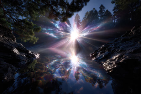 Bright colors radiate from a central point, creating an enchanting light show reflected in still water.