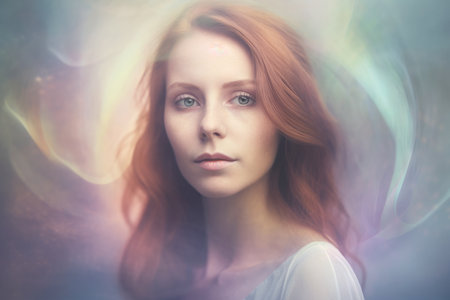 Artistic portrait of a woman with a dreamlike quality, featuring soft and ethereal colors and a blurred, abstract background