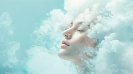 A serene female silhouette with her eyes gently shut, seamlessly blending into wispy clouds that evoke inner peace, mindfulness, and peaceful contemplation in an abs