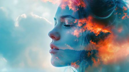 Double exposure portrait of beautiful woman with fire on her face against sky background