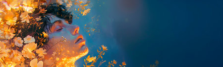 A painting featuring a woman floating in water, surrounded by vibrant colors, capturing a serene moment, A surreal representation conveying the dream-like nature of an ASMR podcast, AI Generated