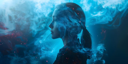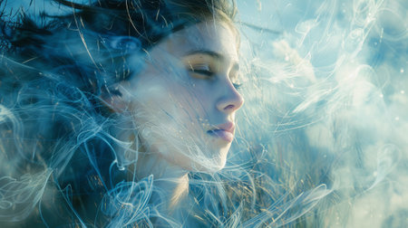 Artistic portrait of a serene woman surrounded by ethereal smoke effects on a blue background.