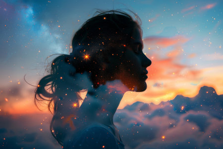 A profile view of a woman blends with a vibrant cosmic backdrop at sunset, creating an ethereal connection between her thoughts and the universe.