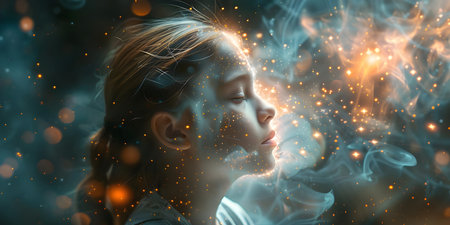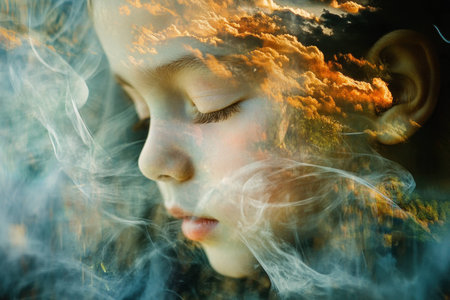 Serene child portrait with dreamy clouds and smoke, evoking tranquility and imagination for wellness and mindfulness concepts