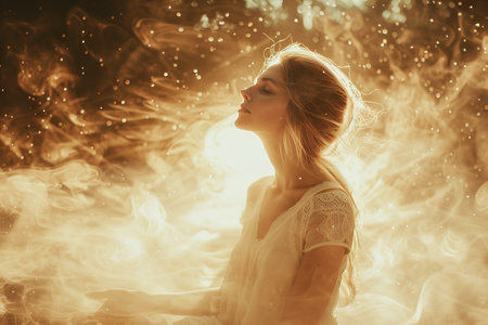 Surreal Portrait of a Woman Amongst Ethereal Smoke and Golden Light AI Generative