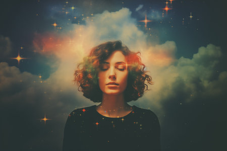 An AI generated illustration of a Young woman in a dream-like state surrounded by clouds of nebula