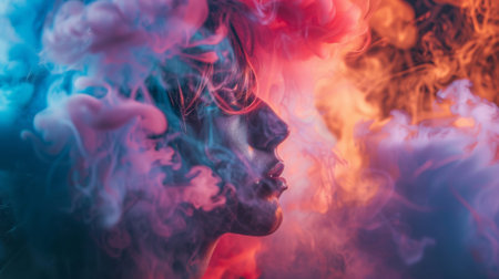 A creative and surreal portrait of a woman surrounded by vibrant clouds of blue, pink, and orange smoke. The artistic and dreamlike image is perfect for themes related to art, imagination, and fantasy.