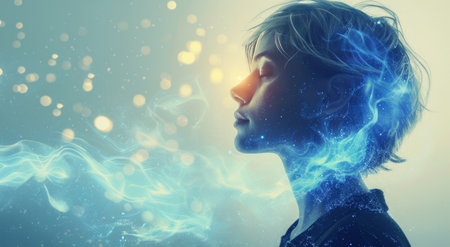 A child stands in a tranquil environment, illuminated by radiant, colorful patterns that dance across their face and body. The atmosphere is ethereal and enchanting.