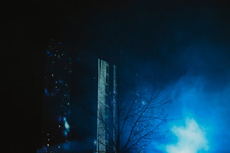 Electric blue lights illuminate the dark atmosphere