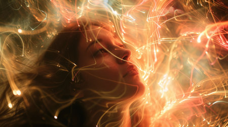 A surreal close-up portrait of a woman surrounded by ethereal light and soft colors, creating a dreamy and otherworldly atmosphere.