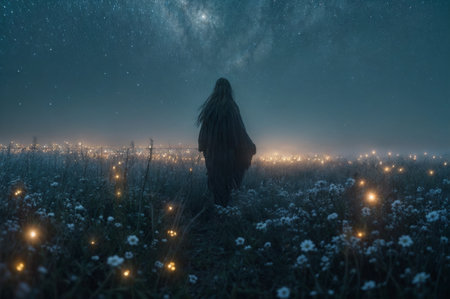 A silhouetted woman walking through a glowing flower field under a breathtaking starry sky, evoking mystery and wonder.