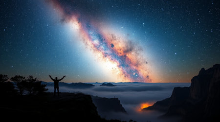 Silhouette of a man standing on the edge of a cliff and enjoying the view of the milky way above the clouds.