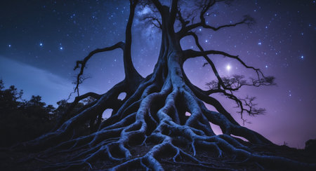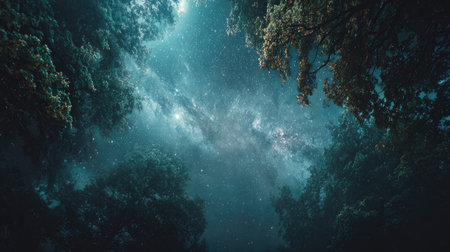 An upward perspective captures a night sky framed by tree canopies. Dark foliage borders a bright, celestial display of stars. The scene evokes a sense of depth and mystery with cool tones and diffused lighting. Suitable for artistic projects and commercial applications requiring a sense of wonder.