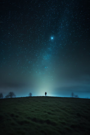 A breathtaking view of a starry night sky with a person silhouetted against a vast mountain landscape, capturing the essence of solitude and wonder in nature.