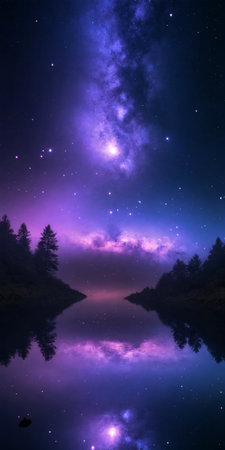 A scenic shot of a beautiful landscape reflecting on the pond water on a starry night background