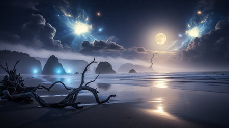 A serene beach at night with a full moon and stars shining brightly in the sky