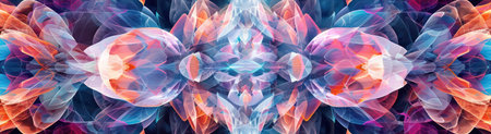 Abstract Digital Art, Futuristic Fractal World, Colorful Fantasy, Neon Glow, Symmetrical Kaleidoscope, 3D Strips, Decorative Flower Ornament, Colorful Abstract Illustration, and Fantasy Textures
