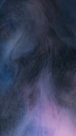 Galaxy smoke. Color haze. Stardust violet blue ink flow in whimsical curls on dark water abstract background. Fantastic cloudy night with clusters defocused fume.