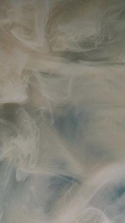 Fluid smoke. Paint water splash. Pastel beige white color silk haze cloud texture ink drop motion on dark blue art abstract background.